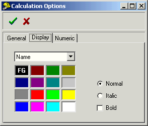 DisplayAffects the appearance of the three columns at Calculation list, in color and font style. |